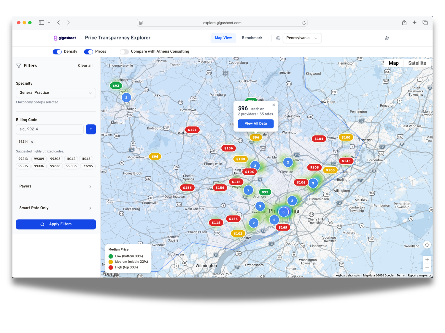 Price Markers — Colored pill-shaped markers placed at each ZIP code centroid, showing the median negotiated rate for that area. Marker color follows a three-tier scale relative to all visible results: