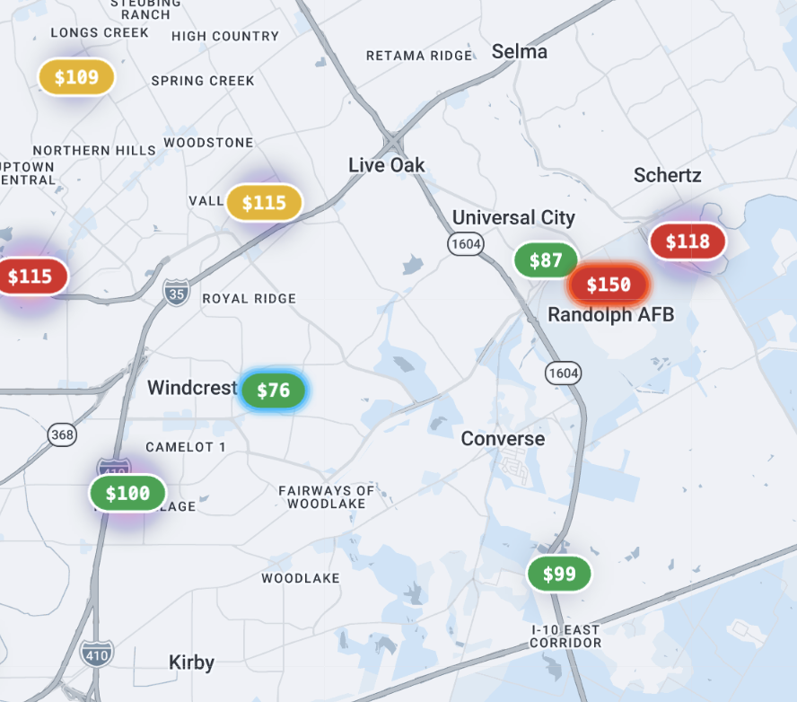 Tese visual cues help users immediately identify price extremes without scanning the entire map. Toggle price markers on or off using the Prices switch in the toolbar.
