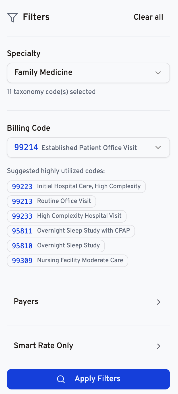 | Payers | Limits results to one or more specific insurance companies or plans. Multi-select is supported. |